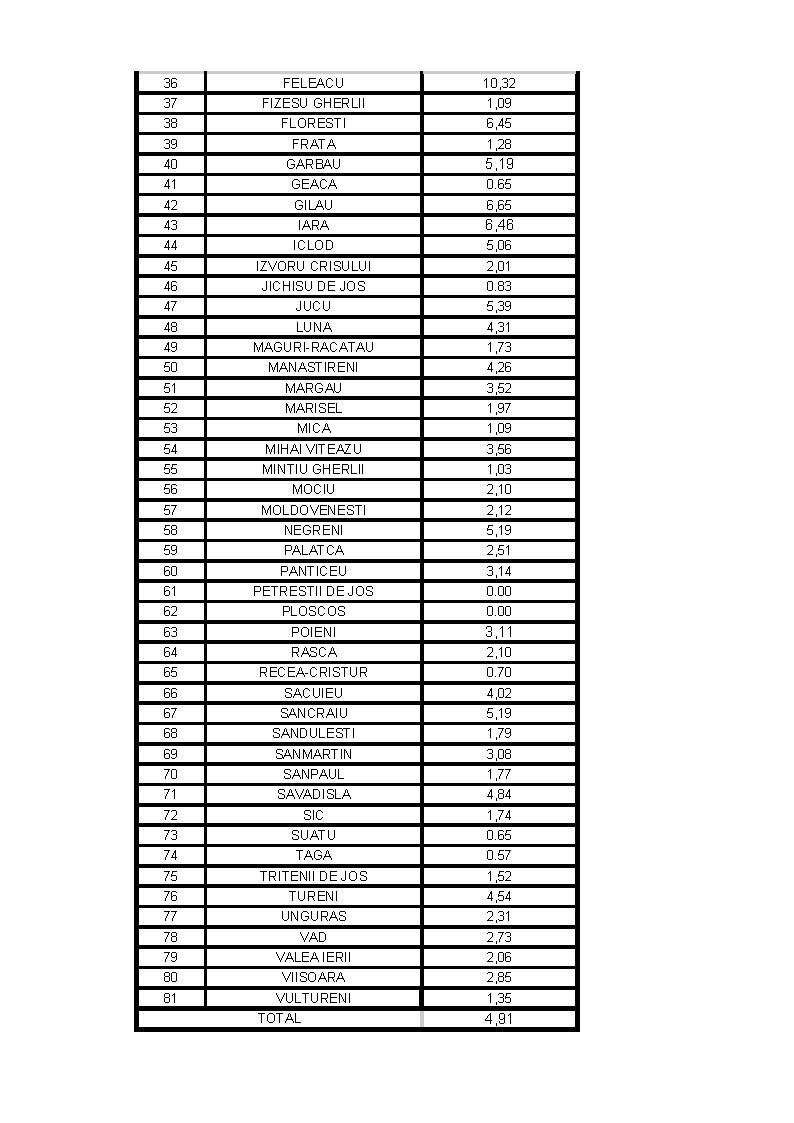 În schimb, incidența cazurilor a scăzut sub 1,5 în 20 de localități din județ. Este vorba despre Căianu, Calatele, Cămărașu, Catina, Chiuiești, Ciurila, Cornești, Cuzdrioara, Dăbâca, Fizeșu Gherlii, Frata, Geaca, Jichisu de Jos, Mica, Mintiu Gherlii, Petreștii de Jos, Ploscos, Recea-Cristur, Suatu, Țaga, Vultureni.