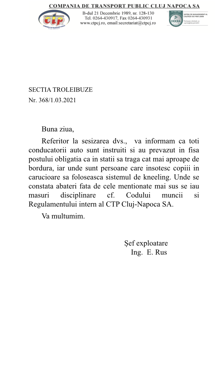 Tocmai am rugat acest sofer de pe linia 21 statia Tempus sa ma ajute la urcarea caruciorului pentru ca eram singura si a oprit la 1 m de trotuar si a spus ca nu e de datoria lui.