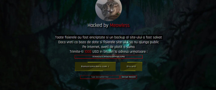 „Toate fișierele au fost encriptate și un backup al site-ului a fost salvat. Dacă vreți ca baza de date și fisierele site-ului să nu ajungă public pe internet, aveți de plătit o sumă. Trimite-ți 100$ USD în bitcoin la adresa următoare”, se arată în mesajul de pe site.
