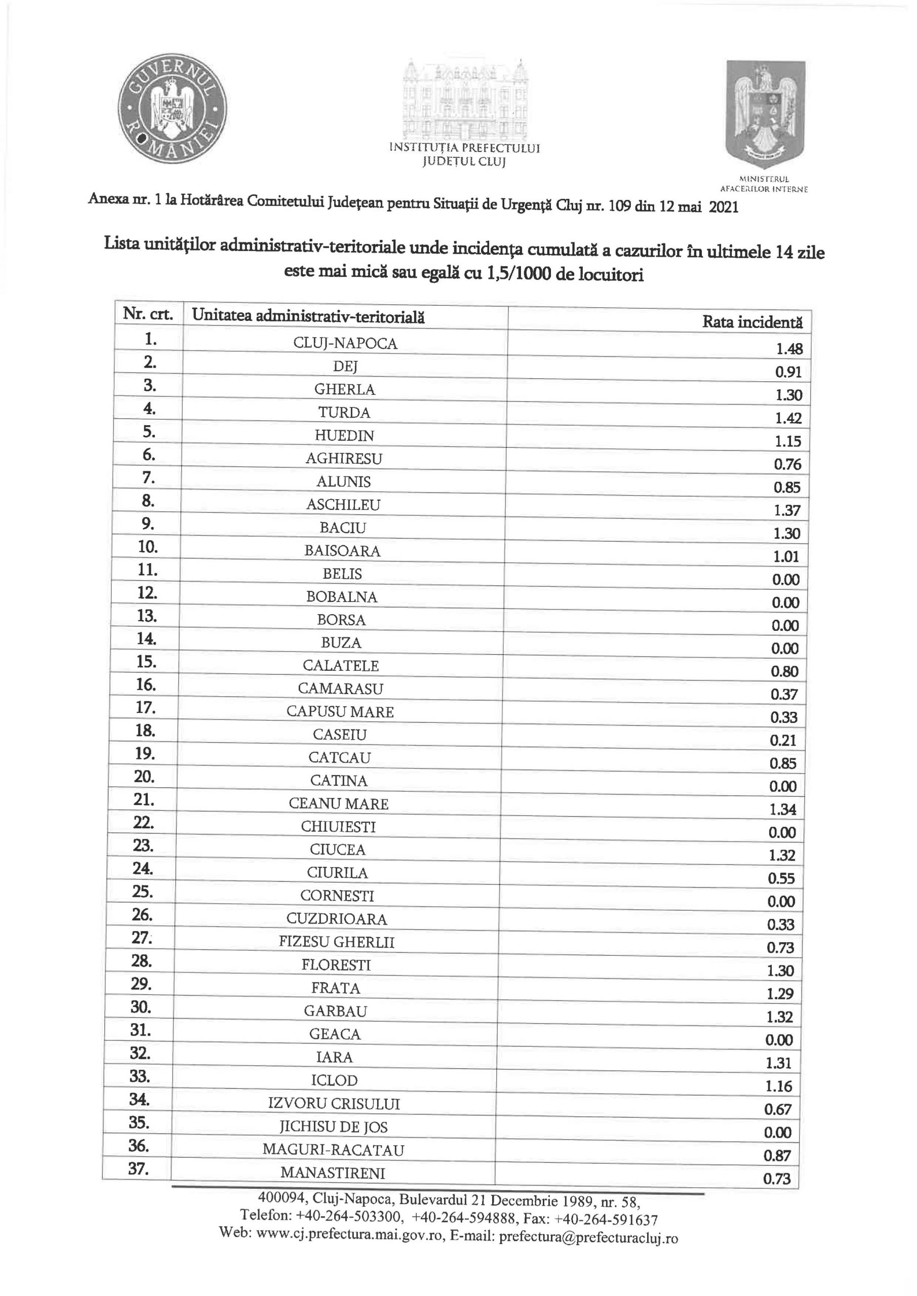 În unitățile administrativ-teritoriale de pe raza județului Cluj, prevăzute în Anexa nr. 1 la prezenta hotărâre, unde incidența cumulată a cazurilor în ultimele 14 zile este mai mică sau egală cu 1,5 /1000 de locuitori, se dispun, pe o perioadă de 14 zile, începând cu data de 13.05.2021, următoarele măsuri:
