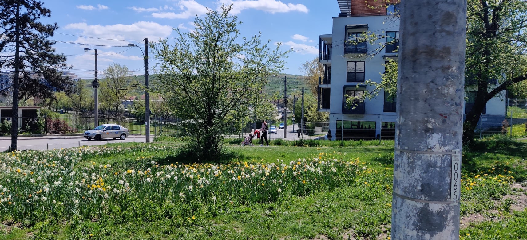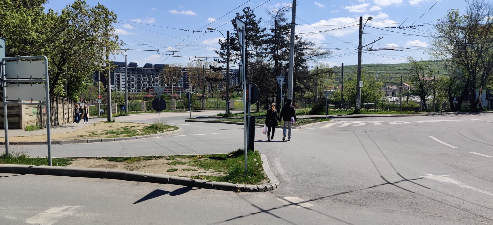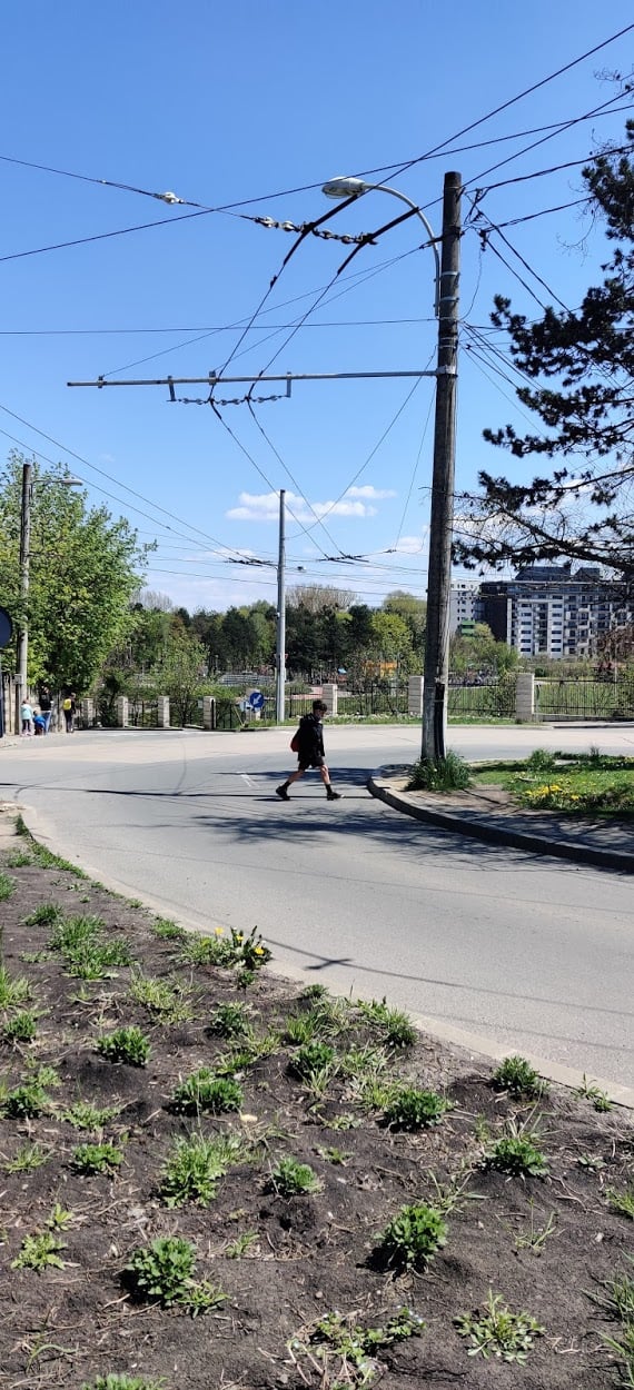 Părinți cu cărucioare, copii pe biciclete care încearcă să ajungă în baza sportivă, vârstnici care se întorc de la cumpărături, toți strecurându-se printre mașini și autobuze sau traversând spațiul verde pentru că în zonă nu a fost amenajată o alee pentru pietoni.