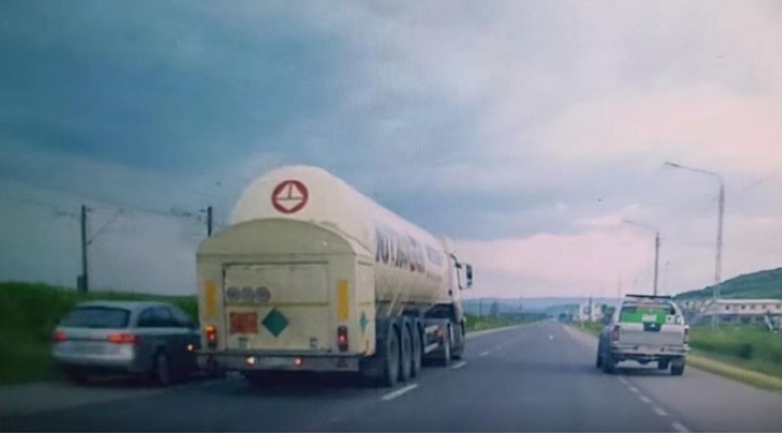 Un alt șofer care se afla în spatele cisternei nu mai are răbdare și, într-o zonă nepermisă, face o depășire inconștientă care ar fi putut duce la o adevărată catastrofă.