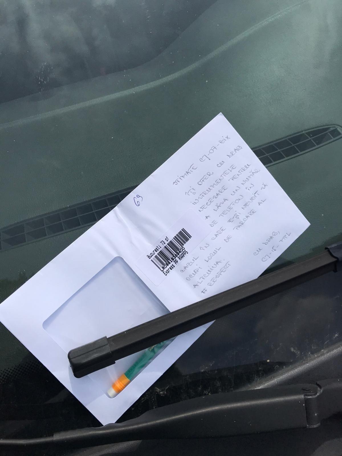 Clujeanul nu a recurs la clasicul gest de ridicare a ștergătoarelor,  ci a lăsat un plic, în care a pus și un creion pentru ca pe viitor șoferul să poată să își lase numărul de telefon.