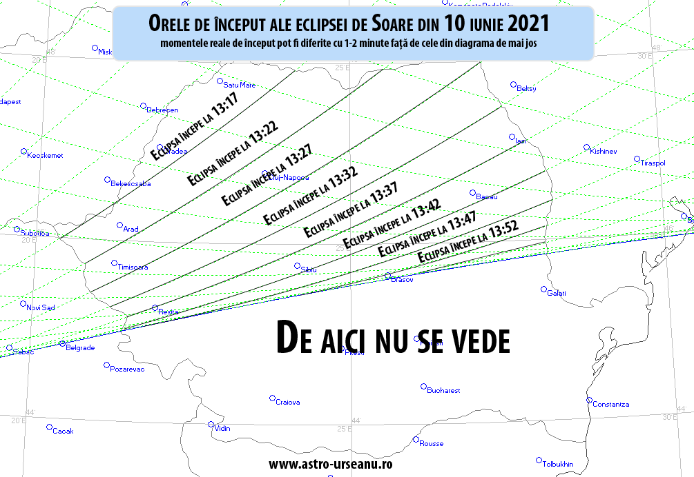 Reprezentanții Observatorului Astronomic „Amiral Vasile Urseanu” spun că aceasta va fi vizibilă începând cu ora 13.17 din județele Bihor și Satu Mare, apoi treptat va deveni vizibilă și în Banat, Transilvania și Moldova.
