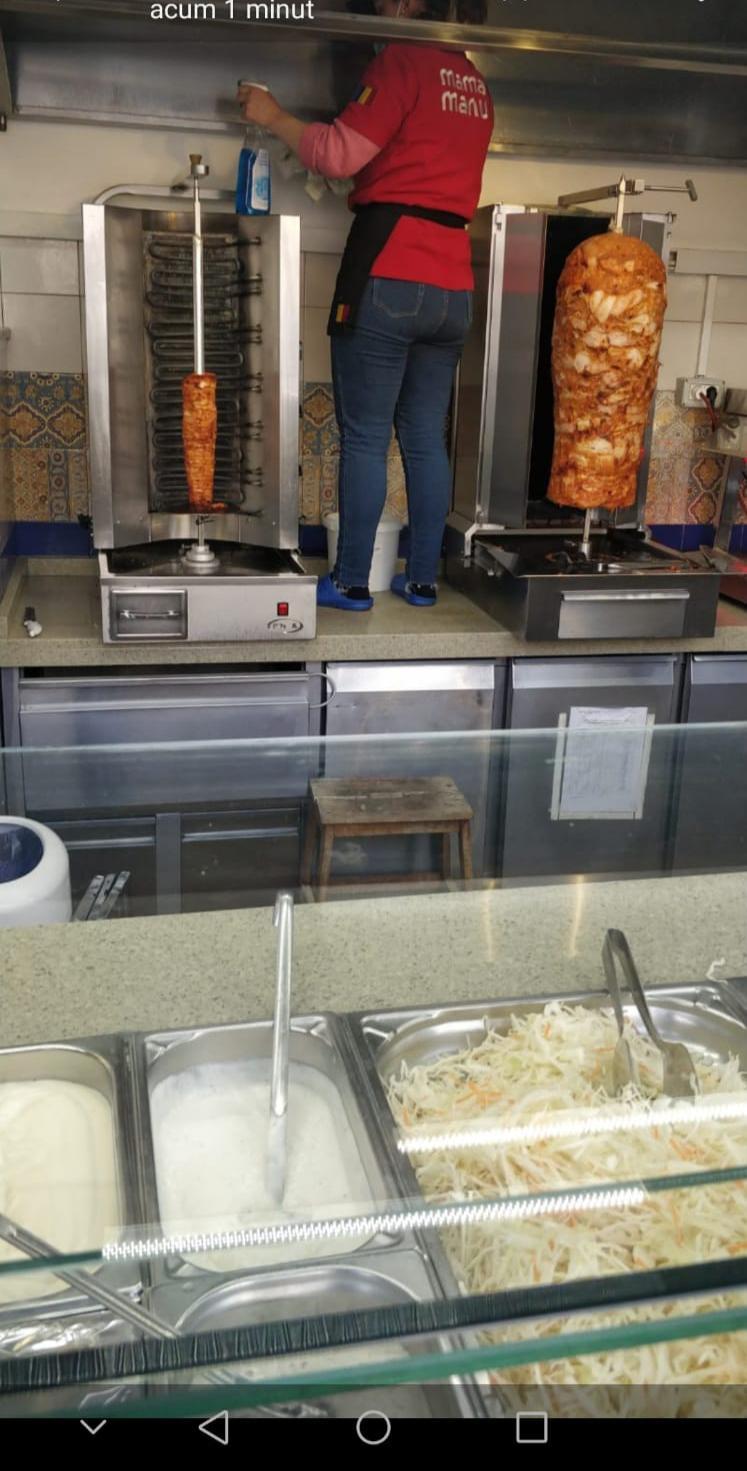 Angajata de la Mama Manu era urcată cu pantofii pe blat și spăla inoxul de deasupra țepușelor cu carne de șhaorma.
