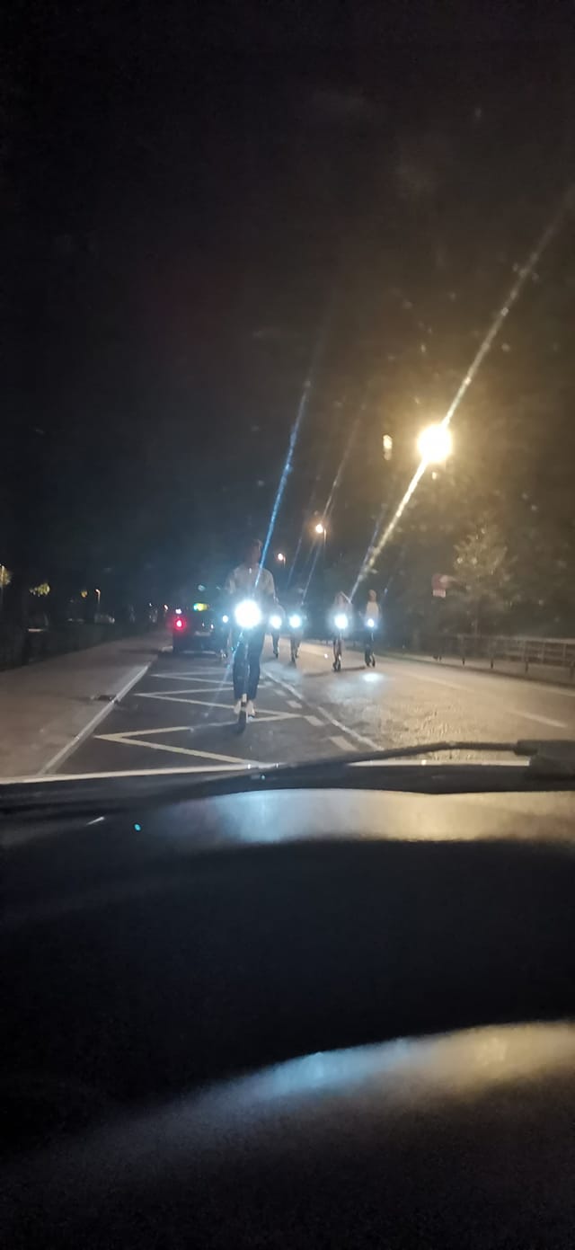 Un șofer a filmat ieri trei persoane pe o singură trotinetă, seara, abia vizibile. Mai mult, într-o altă poză se vede cum cei de pe trotinete merg în grup, fiind în pericol de a fi loviți.