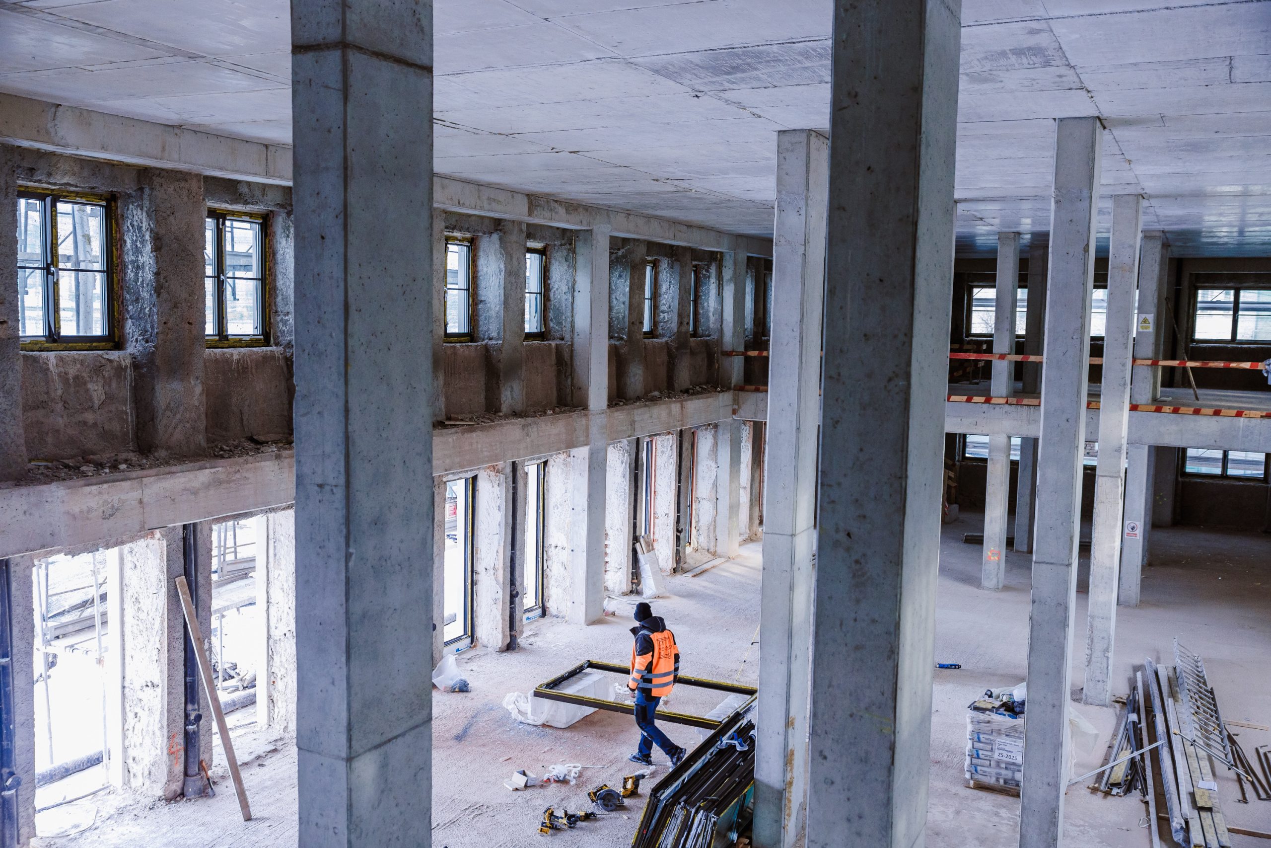 „Structura interioară a fost reconstruită în trei etape, câte o treime din clădire fiind reconfigurată pe rând. Pereții exteriori au fost consolidați prin torcretare – o tehnică de aplicare a betonului pe verticală în straturi subțiri, care asigură stabilitatea zidăriei. În interior, clădirea a fost reconstruită integral, păstrându-se doar pereții exteriori originali. Regimul de înălțime și proporțiile geometrice au fost menținute, și au fost integrate deschideri care permit intrarea luminii naturale în spațiile interioare – o noutate față de configurația originală. Casa scării a fost modernizată complet și dotată cu lift, iar acoperișul a fost refăcut și învelit în tablă, pentru o durabilitate sporită”, a explicat Vlad Samoil, project manager RIVUS.