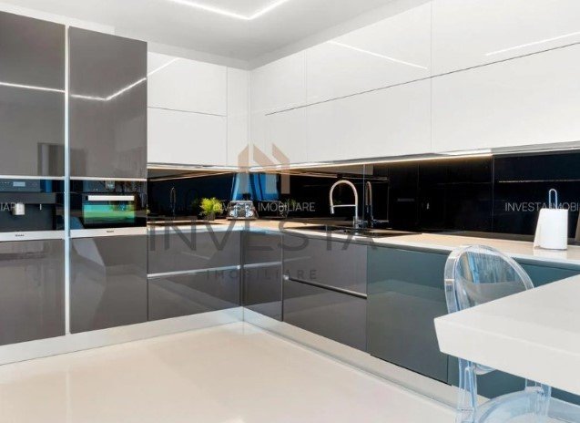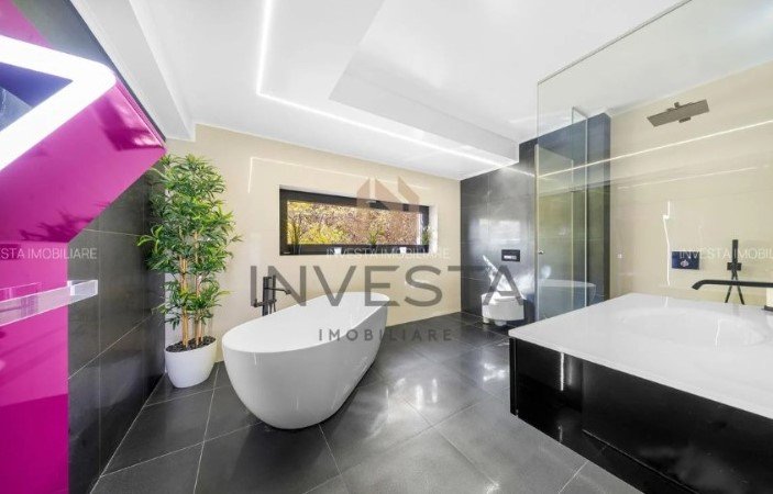 Parterul impresionează prin livingul spectaculos cu pereți integral vitrați și acces direct spre terasa generoasă și piscina infinity de 15×5 m, care se contopește vizual cu orizontul orașului. Zona de dining și bucătăria ultramodernă completează un ambient deschis, elegant și perfect echilibrat.