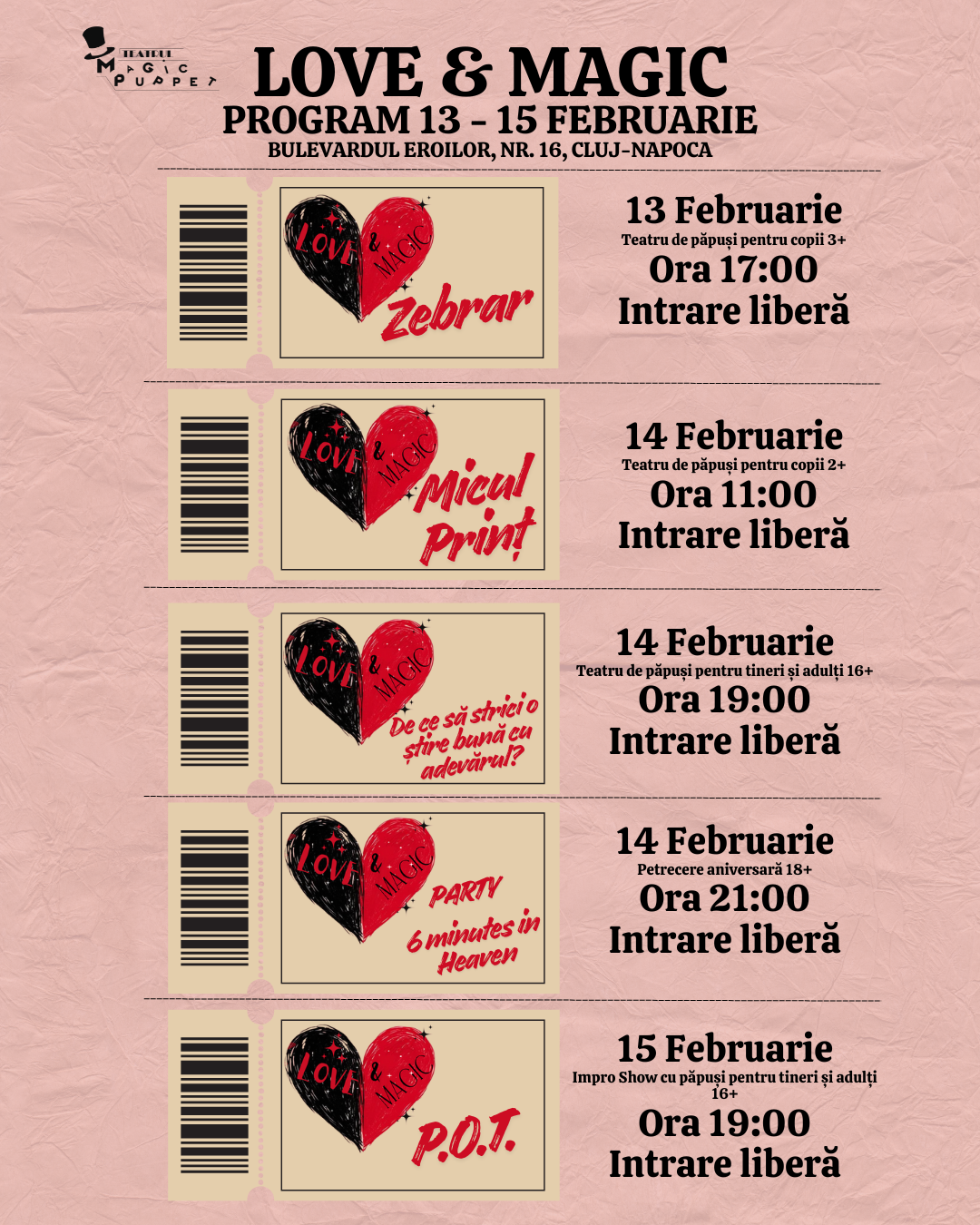 Pe 14 februarie, Magic Puppet împlinește 6 ani de când și-a găsit căsuța pe Bulevardul Eroilor nr. 16, un loc unde teatrul de păpuși prinde viață, emoțiile se spun pe nume și magia se întâmplă zi de zi. Din dorința de a sărbători așa cum știm mai bine, am creat Love&Magic – un mini-festival de emoție, joacă și întâlniri adevărate.
